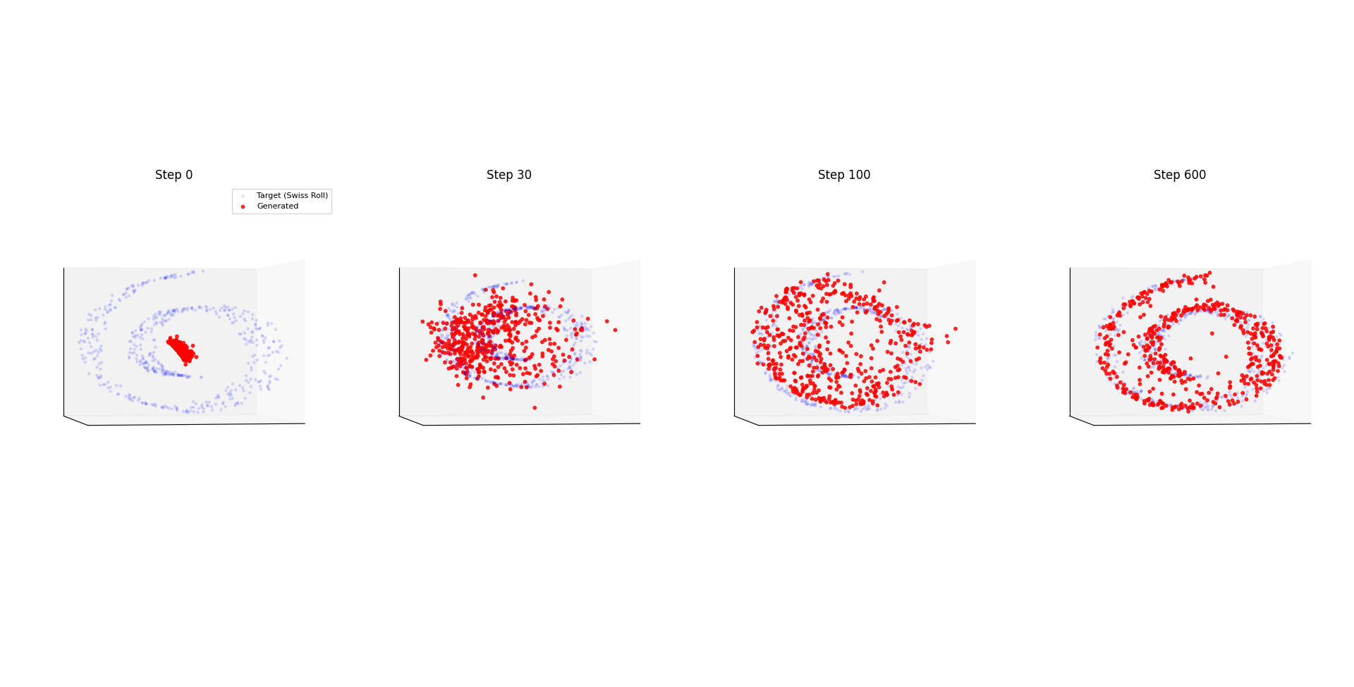 漸漸地訓練下去隨著 EOT loss 降低, NN 最後已經能 mapping 到 Swiss Roll 分布了