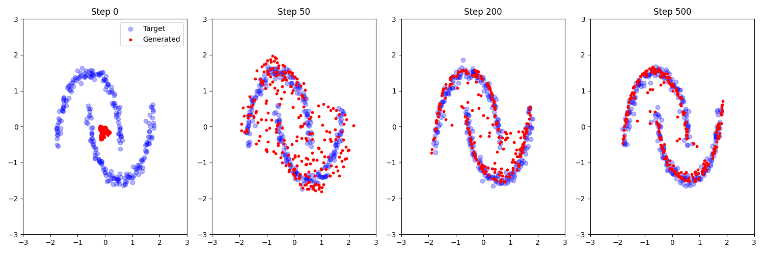 最後本文會用一個 toy example 展示如何使用 EOT 當 loss, 讓 NN 模型學習從一個初始分布對應到目標分布. 並且也會說明使用 Sinkhorn 演算法的 EOT loss 為什麼可以微分.