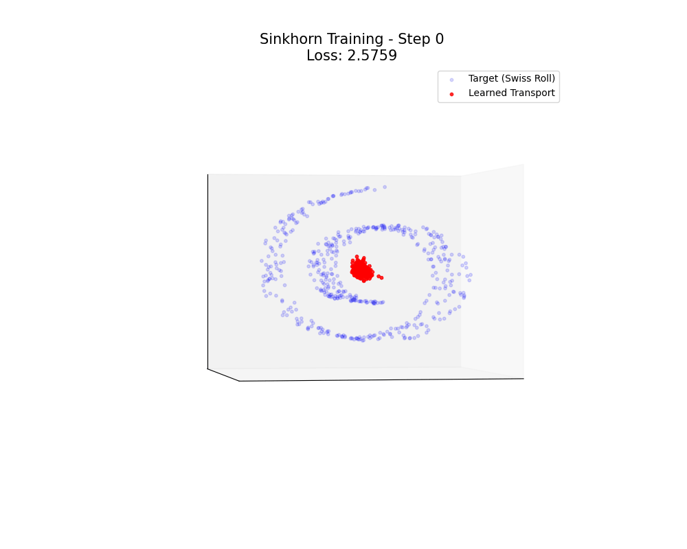而 loss 就使用 EOT, 即 $\mathcal{L}=\text{EOT}(y_{pred},y_{gt})$ 其中 ground truth $y_{gt}$ 的點是從 Swiss Roll 分布採樣.